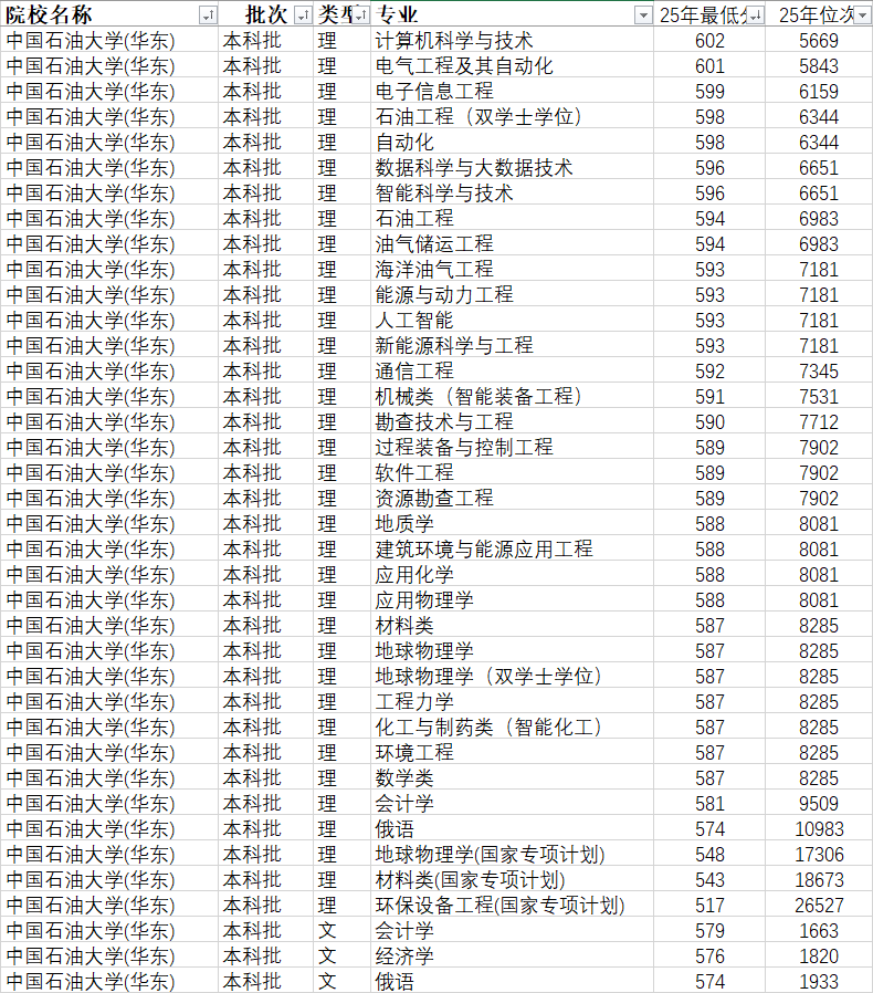 :物理类的石油工程、油气储运工程、资本勘查工程、计较机科学取手艺、电气工程及其从动化,汗青类的能源经济、会计学、,连系2025年登科数据,物理类通俗类最低574分、抢手专业587分,国度专项打算最低517分,汗青类通俗类最低574分,适配中高分段考生,分数梯度清晰,可供分歧位次考生选择,近五年登科分数波动平稳,参考价值高。